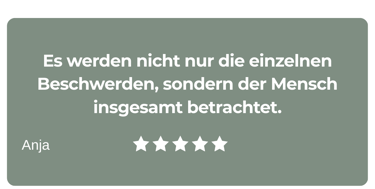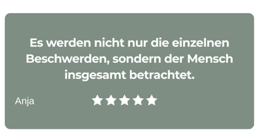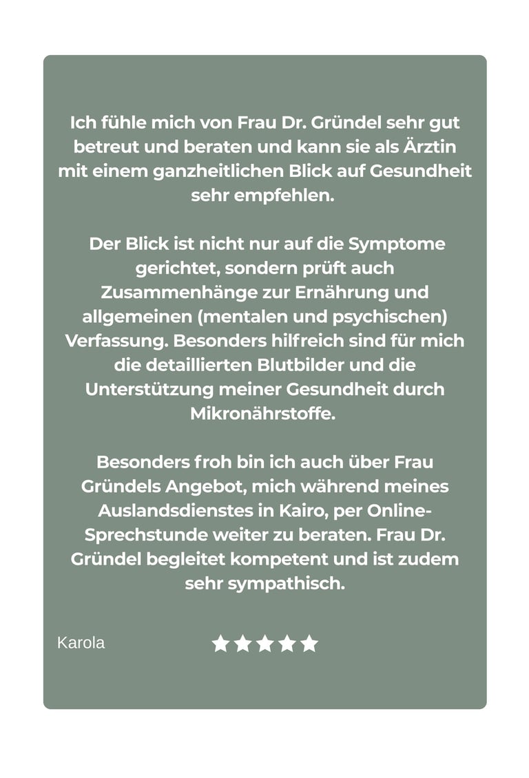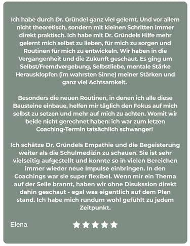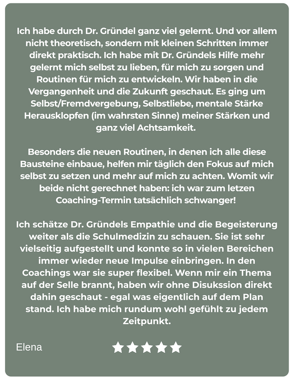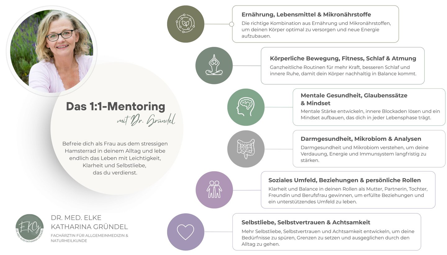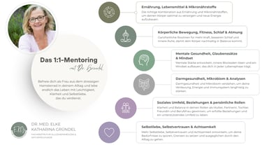 Frau Dr. Gründel bringt in die 1:1-Zusammenarbeit ihre gesamte Kompetenz aus den Bereichen der klassischen Schulmedizin, der Alternativmedizin und der Naturheilkunde mit ein, individuell für dich und deine Situation. Da es wichtig ist, das Thema Gesundheit für das Leben ganzheitlich zu betrachten, wirst du nach der persönlichen Gesundheitsanalyse in den Bereichen Ernährung & Nährstoffaufnahme, Fitness & Bewegung, Mindset & Glaubenssätze, Spiritualität, soziales Umfeld & Beziehungen sowie in der praktischen Implementierung der neuen Strukturen in deinem Leben begleitet, sodass diese auch langfristig in deinem Leben etabliert sein können.